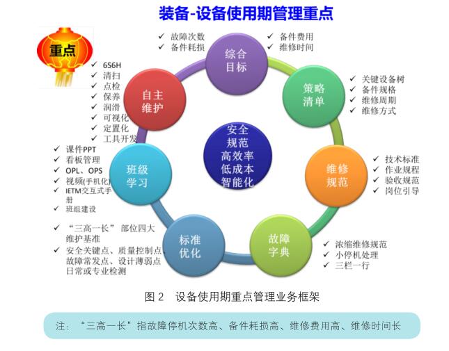 对于多数企业,导入标准的初期阶段,装备设备管理的目标可以用“安全、优质、高效、低成本、智能化”等数个核心词来概括,业务展示会非常丰富,工业企业应按《设备管理体系 要求》原则,依据立标、建制、明责、计划、落实的方式循序落实,其中策划先行十分重要,这点在体系要求中明确的设备维护管理的维修策略理念就体现出来了。企业想尽早尽好的通过导入体系管理取得有效成果,建议结合标准,参考如图 2 所示,从管控设备使用状态,即“三高一长”入手,360 度做好日常设备装备管理基础工作,包括维修策略管理、维修规范管理、故障管理、标准化管理、班组学习技能管理与自主维护管理等。